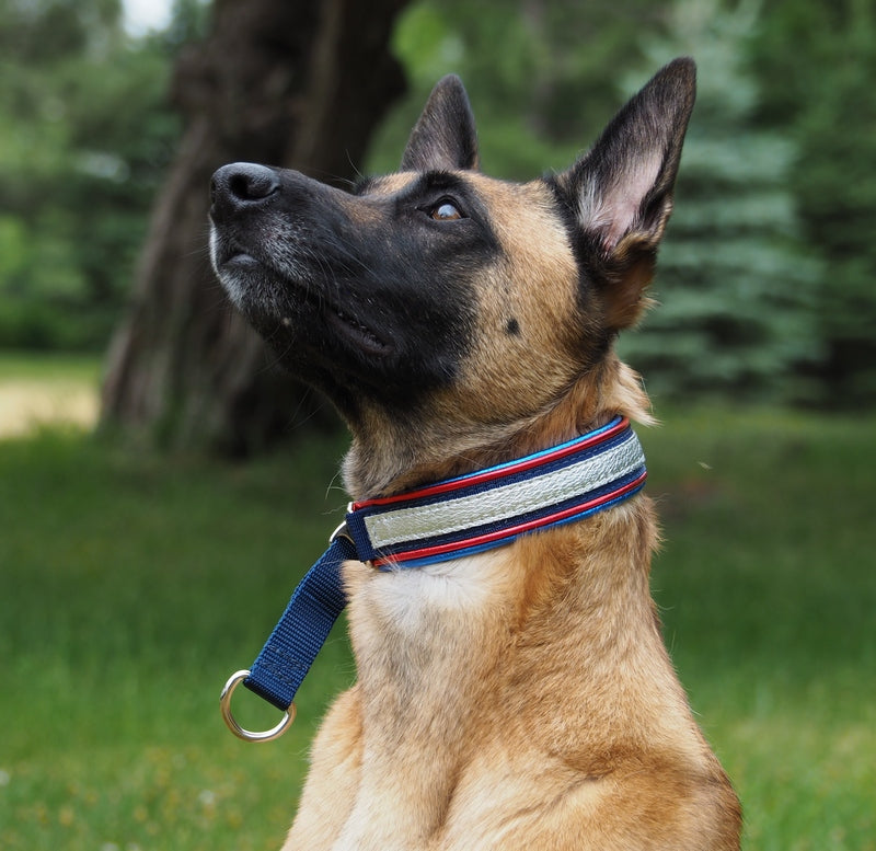 Custom Collar, 1 7/8" Gold, Silver and Blue Amarvati Ribbon